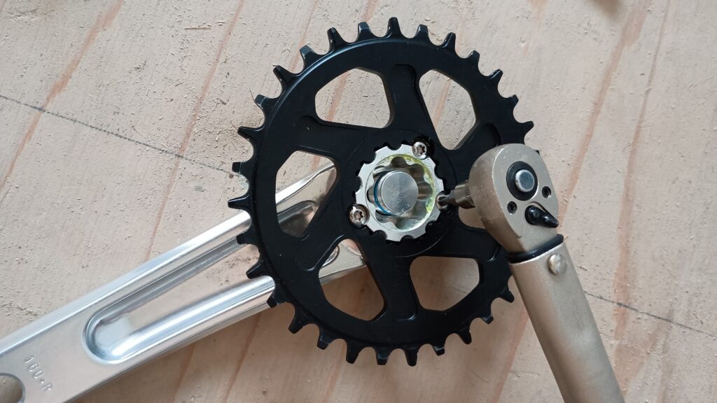 チェーンリングで挟んでネジ止め。T20のトルクスネジ。