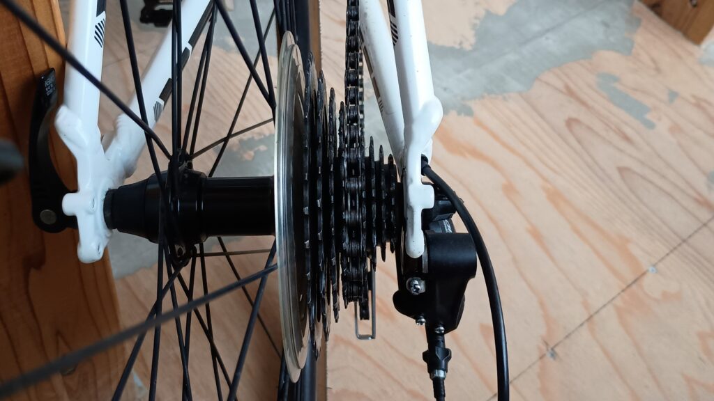 このクロスバイクは9速なので、リアスプロケットの中心はトップからもローからも5枚目のこの位置です。