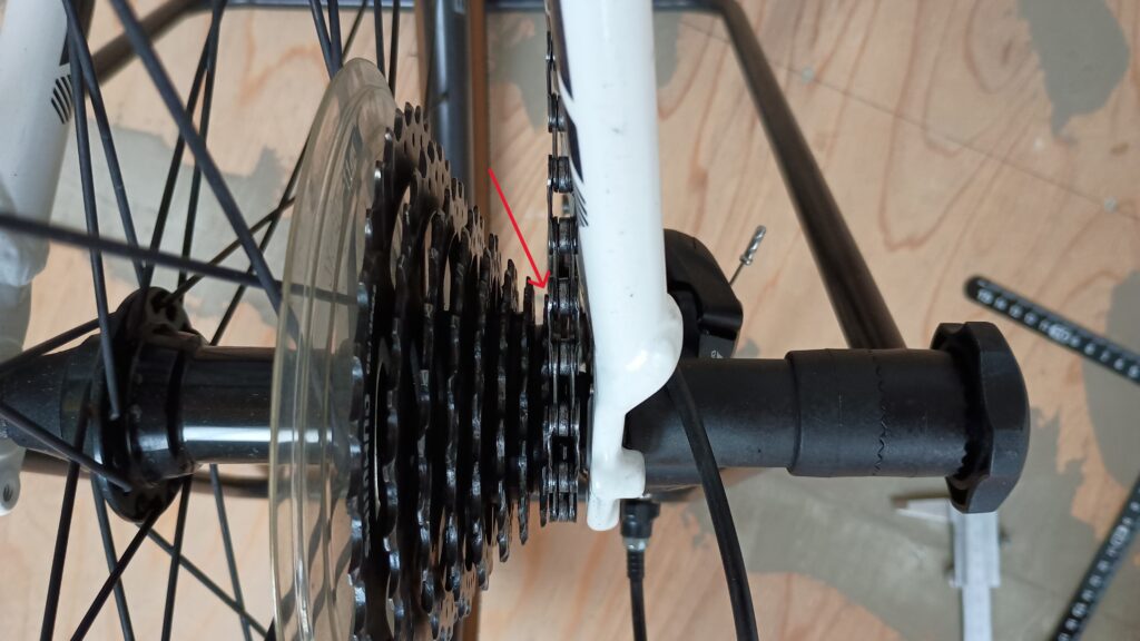 ただしチェーンリングを内側に寄せすぎると、トップ側にギアを入れた時にチェーンの側面が1枚内側のスプロケットに擦れます(矢印のあたり)。
